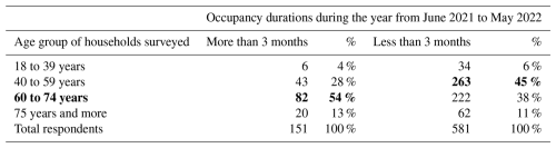 In the questionnaire, owners provided anonymous data on the variation and cumulative presence per year in their second home. Since presence is a key indicator influencing the “inhabitant footprints” overall, we asked for the factors which are likely to have an impact on it such as the age of the householders, the distance between second home and the main residence, or the characteristics of the second home. Additionally, given the significant economic contribution of owners' expenditures and their financial relationship with the local authority, the questionnaire also sought to collect information on rental activities, tax contributions, and spending on food and local services. The data were analysed using flat sorting and cross-tabulation with Excel and RStudio software, which provided insights into the demographic characteristics of second home owners, trends in residential use, factors influencing occupancy or rental, and the second home owners' relationship with the communities.