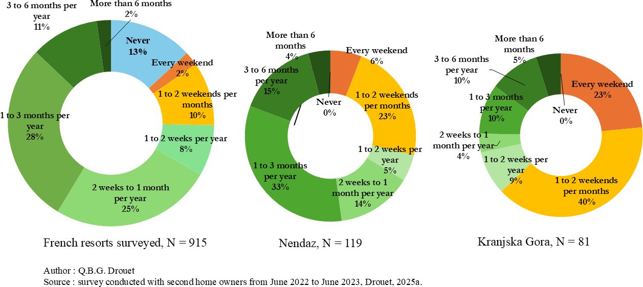 If we look at the annual median occupancy duration of second homes by adding up the median times of occupancy, rental, and lending to relatives, we get 14.5 weeks for the French resorts, 14 weeks for Nendaz, and 15.4 weeks for Kranjska Gora. Based on these median values obtained from our sample of respondents, we can therefore assume that second homes in the areas analysed are under-occupied compared to a main residence when considering for instance the French legal definition of a primary residence, which requires a minimum of 8 months (35 weeks) of occupancy per year (article 2 of the law of 6 July 1989 aimed at improving rental relationships).