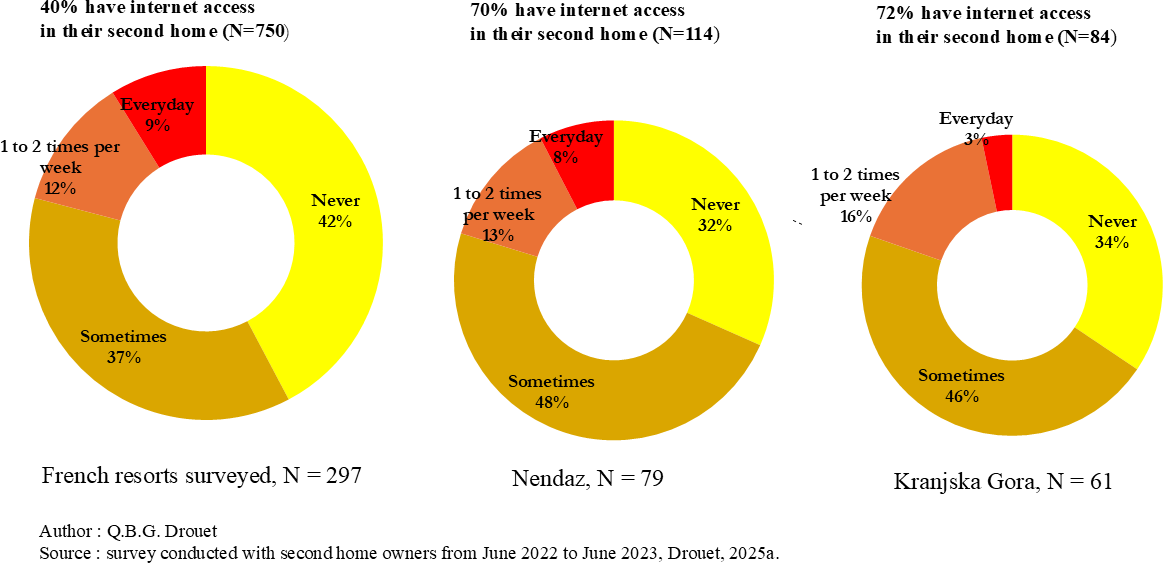 We present the results of the questionnaire on the frequency of remote working at second homes, which also indicates a desire to stay in the property and the Alpine ski community beyond leisure time, representing an aspect of the “inhabitant footprints”. Figure 5 shows that the overall trends of current remote working in second homes are the same in the French resorts, Nendaz, and Kranjska Gora. However, the proportion of householders that have never worked remotely was higher in the French cases. This can be explained by a high proportion of pensioners and a lower proportion of dwellings with internet access in the French resorts surveyed (excluding shared mobile phone connections). 40 % of the dwellings in the French resorts were connected, compared to 70 % in Nendaz and 72 % in Kranjska Gora. This effectively limits the possibility of remote working from second homes. According to our respondents, remote working would increase the presence of owners in the areas analysed by 14 % to 25 % if connectivity were improved.