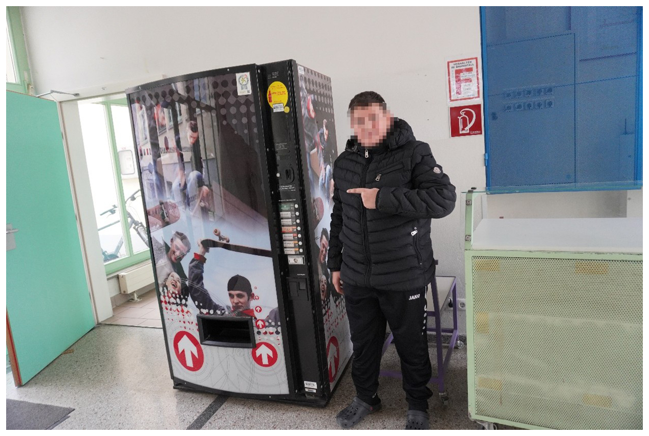 Im zweiten Jahr beschäftigt sich die Co-Forscher:innengruppe „Unsere Wünsche für unsere Schule“ mit den Veränderungspotenzialen bezüglich Essen an ihrer Schule. Die Gruppe entscheidet sich dazu, den Milchautomaten zu fotografieren, der vormals neben dem jetzigen Wasserautomaten stand. Nach gemeinsamer Beratschlagung zum Fotomotiv, das etwas zeigen soll, was gar nicht mehr vorhanden ist, wird als Motiv eine Leerstelle gewählt. An der Stelle, an welcher der Milchautomat stehen sollte, positioniert sich Dominik, der sich besonders für die Wiedereinführung des Automaten einsetzt. Mittels einer Geste möchte er zeigen, dass hier etwas fehlt (siehe Abb. 3). Als in der SHOWeD-Diskussion über das Foto des nicht vorhandenen Milchautomaten und die damit einhergehenden Emotionen gesprochen wird, sagt Dominik, dass er traurig sei, weil der Milchautomat, der „günstig war“, „einfach weg“, also einfach verschwunden ist. Seine Mitschüler bekräftigen diese Empfindung und lamentieren ebenso den Verlust des „günstigen“ Milchautomaten (Dominik3Rt2_00:08:12).