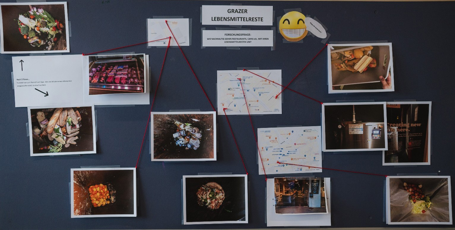 Diese irritierende Erfahrung verarbeitet die Gruppe auch visuell in ihrer Ausstellung: Alle Fotos bis auf eines zeigen konkrete Einblicke (in Bio-Mülltonnen, in die Fleischtheke, in einen Schnellkomposter) – allein ein Foto zeigt die Glasfront des Geschäfts, dass ihnen den Zugang verwehrt hat. Die Fotos der Co-Forscher:innen zeigen also nicht nur Einblicke in die konkreten Tonnen (und damit den Umgang der Betriebe mit Lebensmittelabfällen), sondern auch das Auf-Distanz-halten eines Betriebs, der keinen Einblick in den eigenen Umgang mit Lebensmittelresten gewährt. Man blickt von außerhalb auf den Eingang.