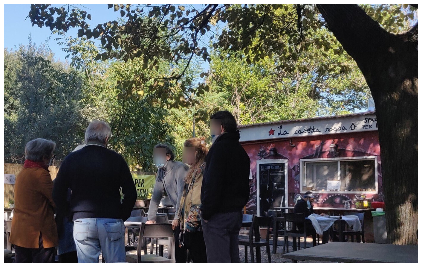 The third is Casetta Rossa (CR), a small house located in a once-abandoned park and occupied in 2001. Its goal was to create an intergenerational space for encounter, discussion, and leisure. It offers a range of political, social, and cultural activities, as well as a daily restaurant operated by a cooperative. It is located in Garbatella, a formerly working-class garden-city neighbourhood that has become increasingly expensive but still remains a left-wing stronghold, with the district's mayor being linked to a local SMP.