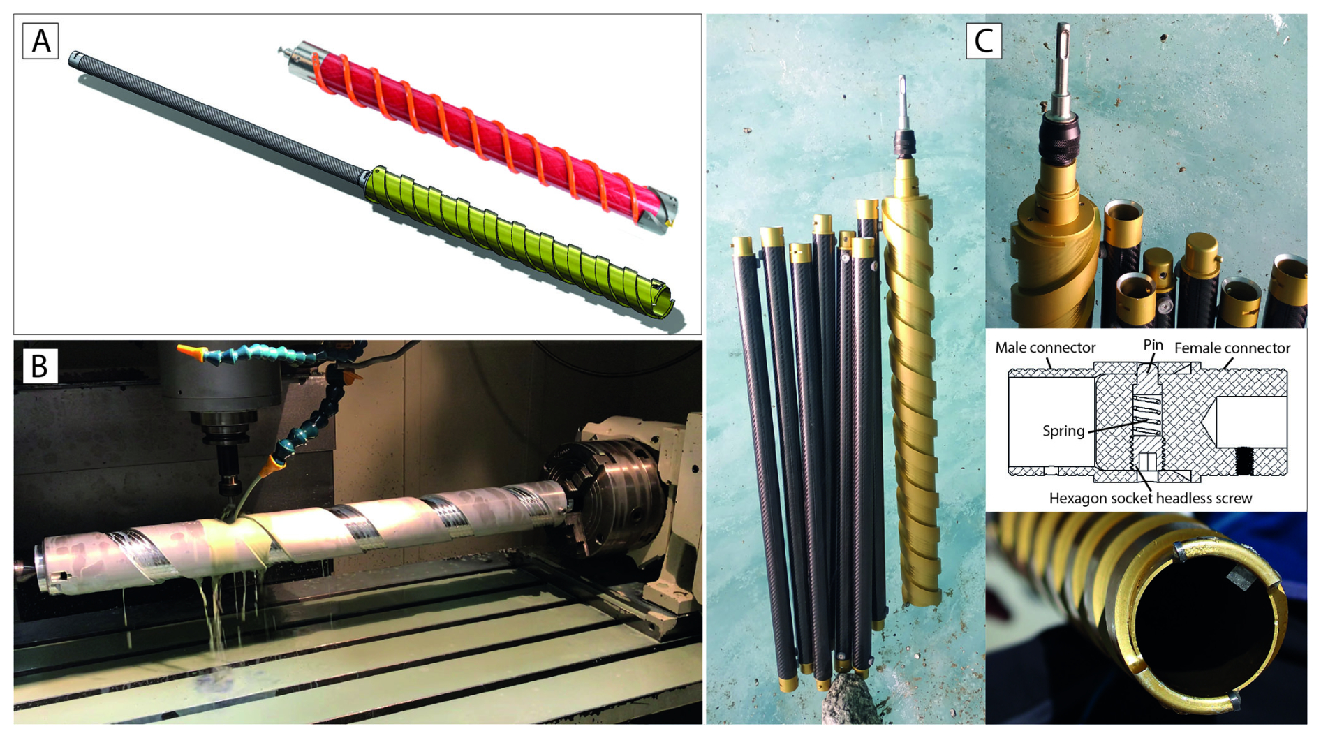 The design of the quick connectors (Fig. 2C) between the extensions of the coring tube required several iterations and mechanical simulations. The system uses quick connectors with a return spring that is released with a special key. Carbon tubes from the body of the extensions, in which the male and female parts of the quick connectors are embedded, form 75 cm long extensions for a total length of 9.75 m (13 pieces). Each quick connector is bonded with an insert at the end of the male or female part and secured with a screw that passes radially through the carbon body. A prototype was produced to test handling and reliability under field conditions. Carbon extensions were subcontracted to meet the delivery schedule for the corer.