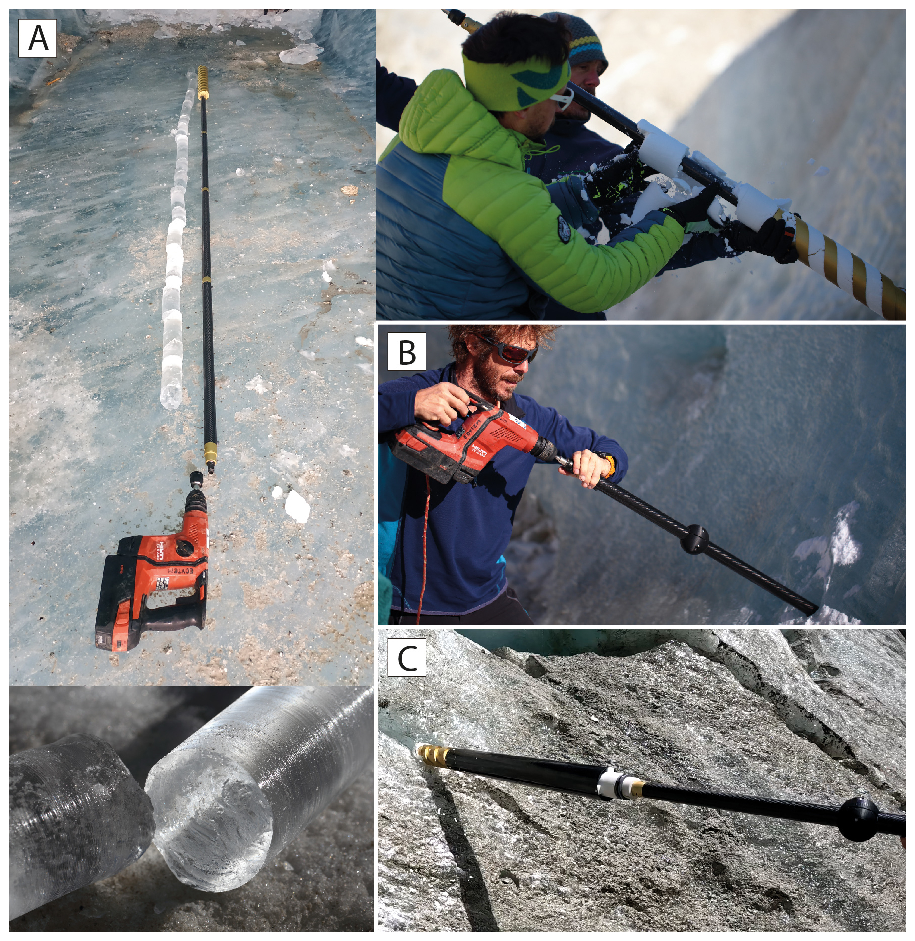 The first one was carried out in an ancient ice cave in October 2021 (Fig. 3A). The aim was to test (1) the efficiency of the drilling head and the drilling rate, (2) the evacuation of the ice chips, (3) the efficiency of the mechanism for locking the core in the corer before extraction (Fig. 2C), and (4) the mounting–dismounting of the carbon extensions. Drilling proved to be extremely efficient, with the drilling head having no difficulty penetrating the ice, driven by a 36 V drill. The evacuation of the ice chips was trickier because, although the first few centimetres of drilling saw the ice chips be well driven in the helix, they quickly created a mixture of ice chips (and liquid water) that stuck to the groove and above the corer, preventing subsequent chips from moving up the groove. This creates a plug with a high liquid-water content, which can even stop the corer being pulled up. A 4 m long ice core sample was taken, made up of around 15 elements. Only the first element is in one piece ( 70 cm). The core elements are then, on average, about 30 cm long each as there is a proven risk for the corer to become blocked due to a plug of chips forming above the corer. The test also provided an opportunity to work on the tension of the core locking mechanism. Following this initial test, it was decided to build a chip chamber, a plastic cylinder which would surround the coring tube and its groove, thus preventing the ice chips from getting into contact with the ice on the borehole walls. With this, the core locking mechanism is effective if the ice core to be removed is first broken off at the bottom of the borehole; otherwise, the mechanism does not apply enough force on the ice core to break it off, and the core slides out of the coring tube. Before each ice core removal, a few energetic jerks are applied to the drill and, therefore, to the corer to help break up the core before extracting it. Several attempts are sometimes necessary. Finally, the mounting–dismounting of carbon extensions is fairly efficient as long as the tools required for the operation are attached so that they do not get lost on the slope.