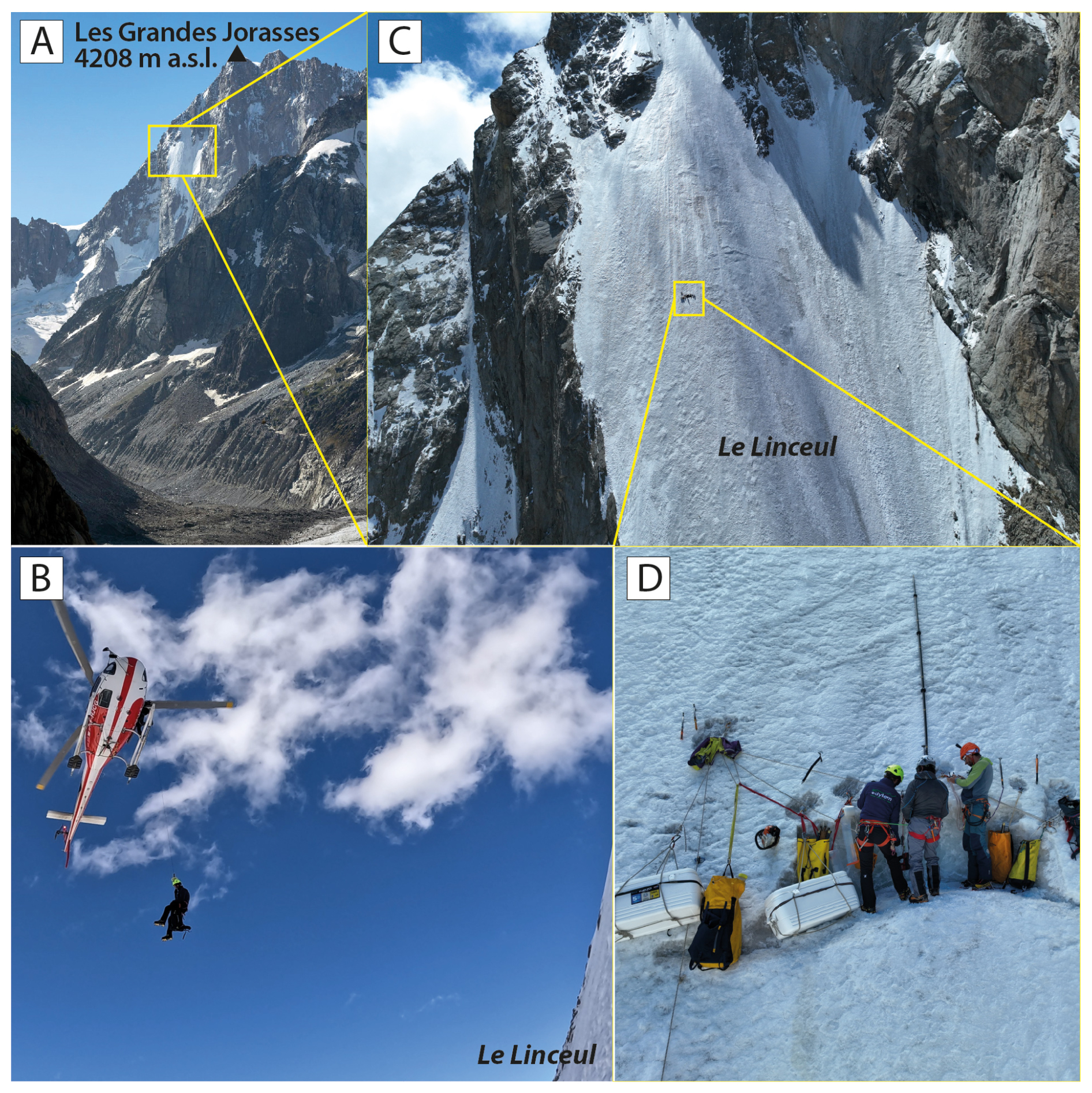 Figure 4The coring mission on 4 July 2023 in the Linceul, the main IA of the Grandes Jorasses northern face (A and C; 4208 m a.s.l.). (B) Winching operation. (D) Organisation of the drilling site with two large iceboxes.
