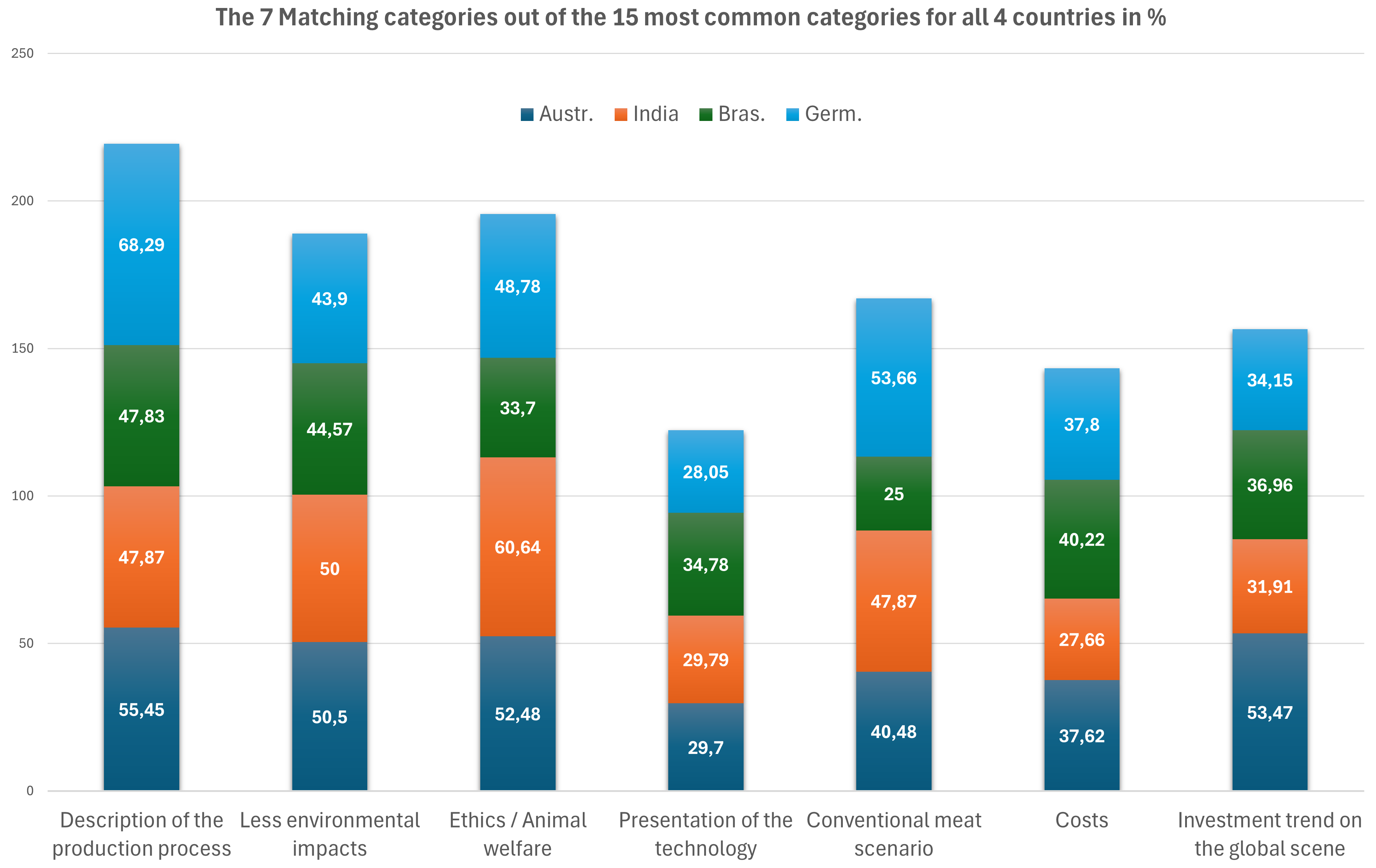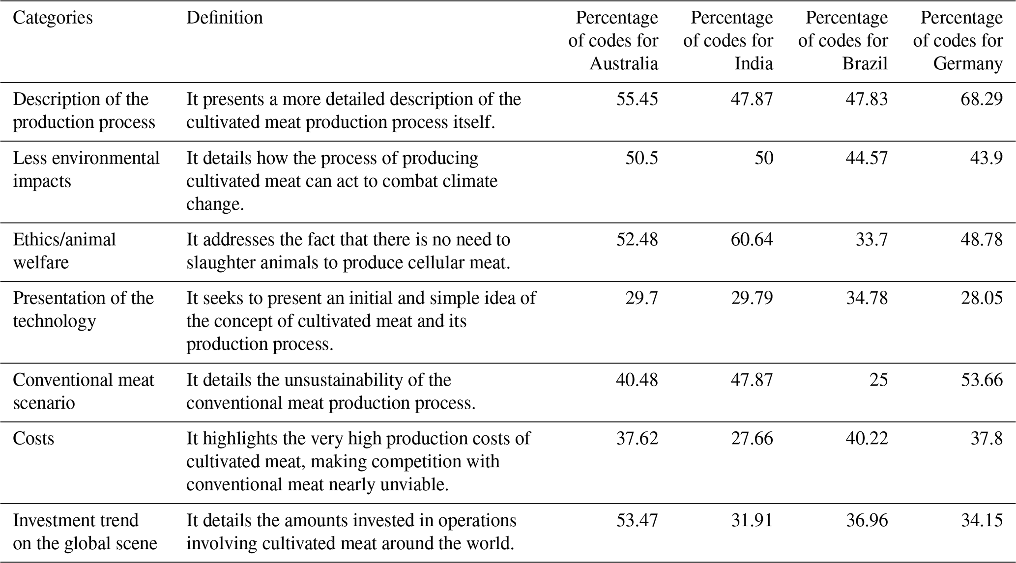 A key element emerging from the joint analysis of the four countries is the striking similarity in the main topics covered by the media in each nation. Across all contexts, discussions prominently feature technology, the market, investments, and the potential benefits of CellAg. The most approached topic for Australia, Brazil, and Germany was the “Description of production process”, and for India it was “Ethics/Animal welfare”. However, considering all the codes assigned to the news from the four countries studied, we conclude that two areas have received greater attention in the news, namely (1) market and investment and (2) research and development. This suggests that CellAg is considered a promising market opportunity worthy of financial investment, while also highlighting the necessary advancements in research and development to unlock its full potential.