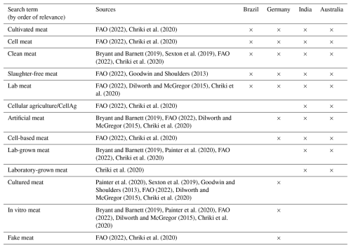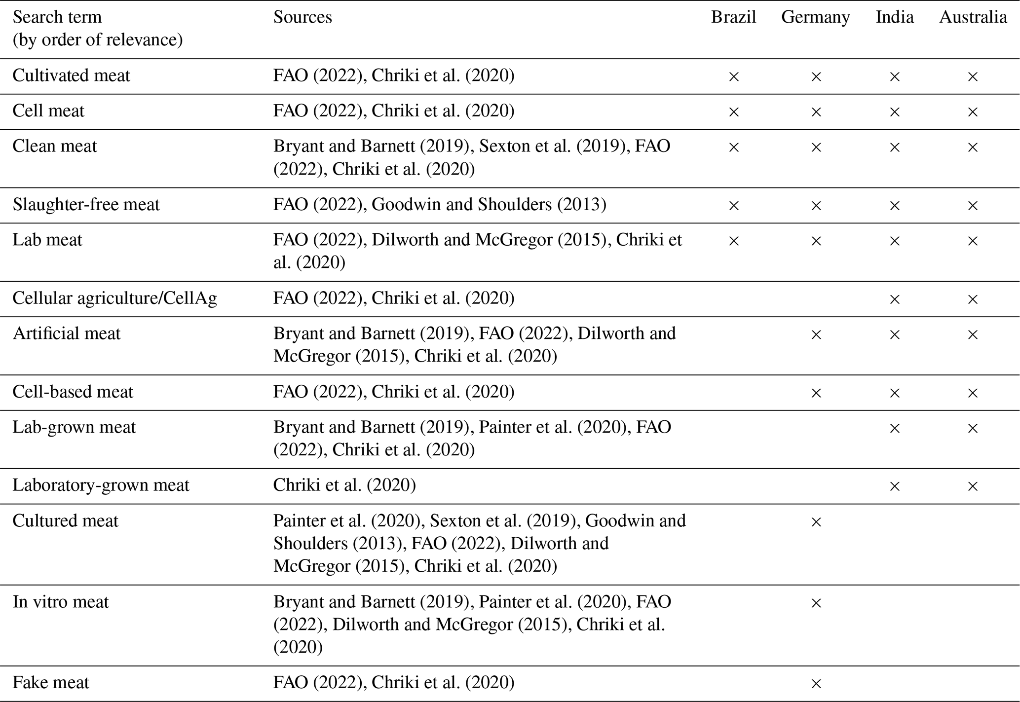 Based on reports from the Good Food Institute (Bryant and Krelling, 2021) and on a review of the previously published literature on CellAg coverage (e.g., Hopkins, 2015; Bryant and Barnett, 2019; Painter et al., 2020; Sexton et al., 2019; Goodwin and Shoulders, 2013; FAO, 2022), a list of keywords was devised for each case. The terms remained largely the same throughout all cases, yet the list was complemented by case-specific terms that were found to be additionally salient (Table 2)1.