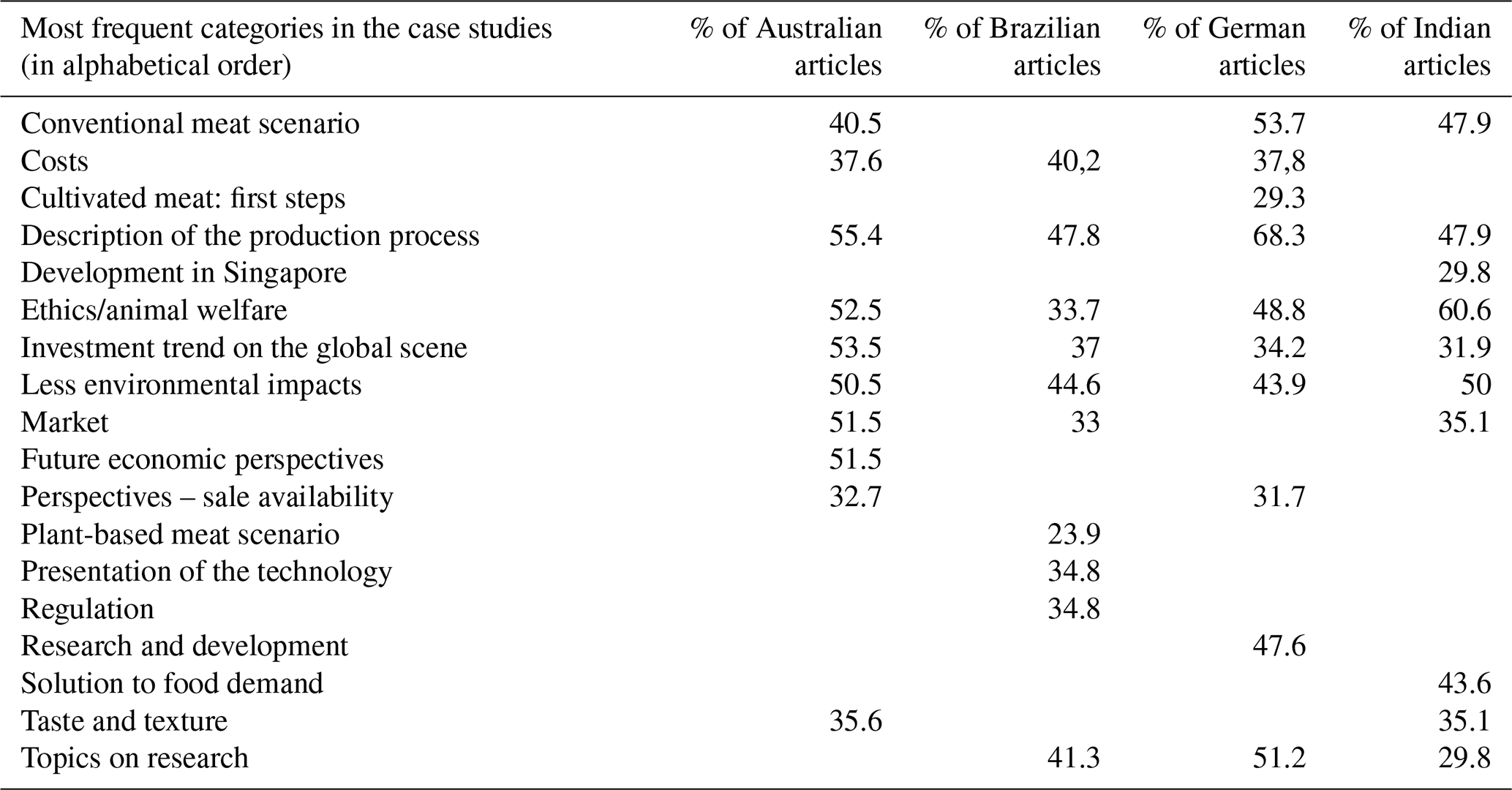 In total, more than 30 thematic categories were identified regarding how CellAg is presented as a prospective technology. We present the 10 categories with the highest percentage of coverage for each case (see Table 3).