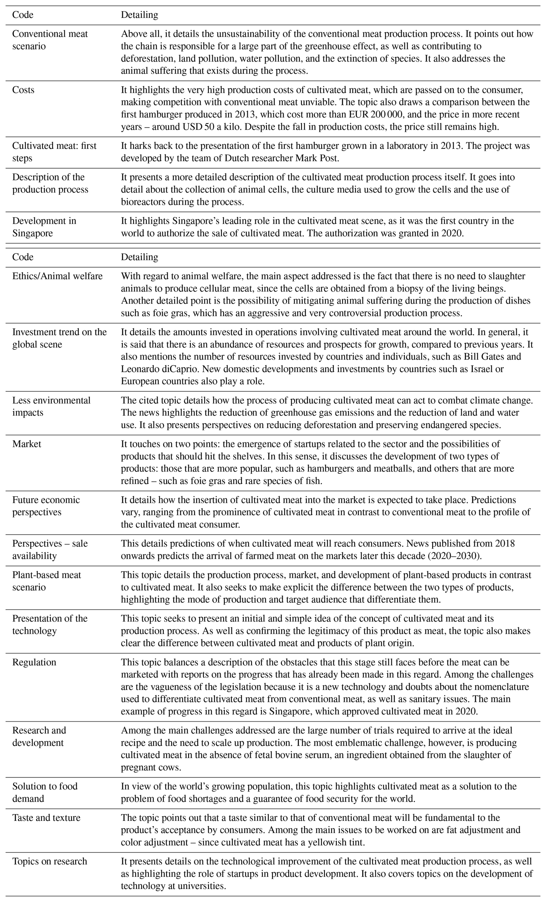 The most frequently mentioned category was “less environmental aspects”, which highlights how CM may use less water and land than conventional meat, as well as emitting fewer greenhouse gases. The “Ethics/Animal welfare” category is only ranked eighth. This category often occurs interspersed with other categories. This is in contrast with surveys, in which Brazilians mention animal welfare as one of the most important concerns regarding conventional meat, together with environmental challenges (Valente et al., 2019; Mendes et al., 2025). This seems to be an example of a media narrative conducting public discussion in a certain direction, more specifically away from specific issues which may be considered non-strategic or damaging to the status quo of conventional production. How much this is intentional, and, if so, the potential reasons and agents behind it, remains to be studied.
