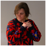Eléonore est debout et montre son profil aux autres. Elle ne les regarde pas et remue, malaxe quelque chose qu'elle tient dans sa main gauche. Elle semble y rajouter un liquide, qu'elle cueille ensuite dans ses mains. Mais ce liquide se transforme. Il devient dur. Ses mains semblent l'agripper. Soudain elle lève très rapidement le bras droit et porte sa main vers la bouche tout en tenant quelque chose (un peu comme si elle portait un verre, ou un pot vers la bouche). Elle penche sa tête en arrière pour mieux boire – elle semble en tout cas boire le contenu de ce verre, de ce pot . Quelques instants plus tard, elle tient ses joues, les caresse et les étire (main droite les caressant avec le dos de la main, main gauche poussant ses joues jusqu'aux yeux). Elle fait ensuite une toute petite rotation de ses mains sur le visage, pour les glisser après le long du cou jusqu'à hauteur de son plexus. Tout en gardant la tête haute et le regard vers le plafond, elle remonte les mains jusqu'à hauteur de son menton et semble envoyer quelque chose dans l'air. Elle accompagne la chute de cette chose avec ses mains en traçant une ligne droite du haut vers le bas et recommence la procédure : elle remue quelque chose à hauteur de son plexus, elle lève le bras et porte cette matière invisible vers la bouche, puis elle redescend les mains à hauteur cette fois de son estomac, malaxe la matière, tout en la tordant (cela ressemble un peu au geste d'essorage d'un tissu), puis la déplace à droite, la remue et la porte de nouveau à sa bouche, elle la boit (la chose est donc momentanément redevenu liquide) tout en soutenant son bras droit avec sa main gauche. Elle redescend la chose, comme si cette fois c'était un sac, un tissu un peu lourd, mouillé. Tout en procédant à une semi-rotation de la droite vers la gauche et tout en regardant vers le sol, elle étire la chose cette fois avec les deux mains (l'une dans l'autre) vers la gauche. Elle la tire ensuite presque à hauteur de son épaule (la matière de la chose semble plutôt souple, néanmoins robuste et surtout élastique) et, sans lâcher la chose, elle revient presque dans sa position initiale, légèrement tournée vers la gauche, regard vers le sol. Cette fois elle étire la chose en deux étapes : elle la tire d'abord jusqu'à hauteur de sa taille, tout en se tournant en même temps vers la droite, (de manière à ce que l'on voit de nouveau son profil) et finit par tirer la chose vers le sol, mais pas complètement : à environ 20 cm du sol cette dernière semble perdre son élasticité.